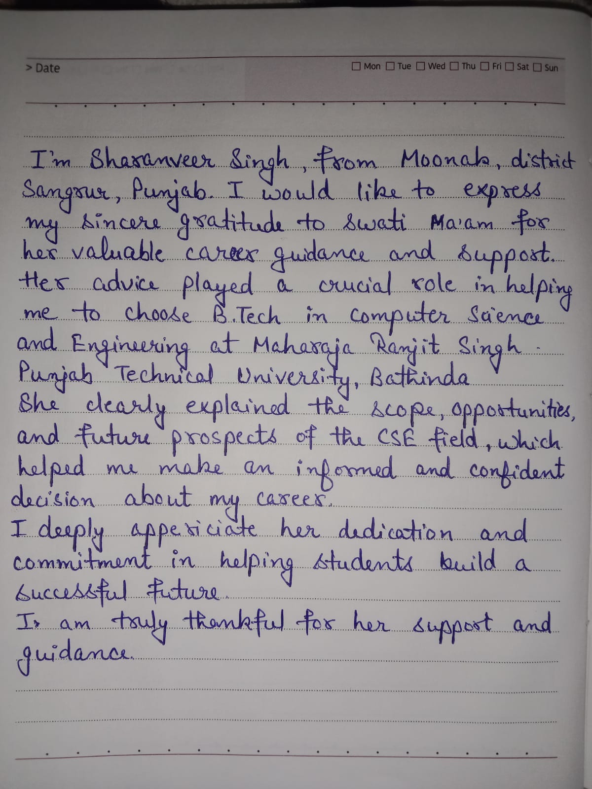 Her advice played a crucial role in helping me to choose B.Tech in Computer Science and Engineering at Maharaja Ranjit Singh Punjab Technical University, Bathinda.